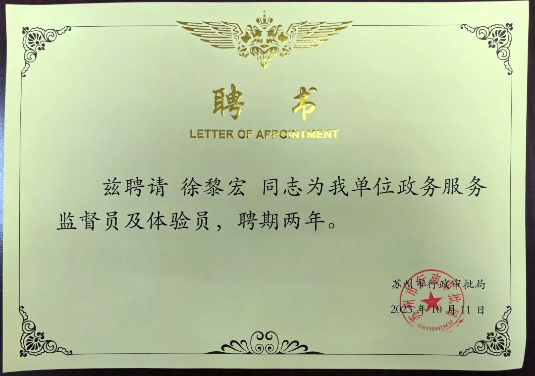 苏州市行政审批局在苏州市政务服务中心举行的政务服务监督员及体验员聘任仪式顺利召开。苏州分所主任徐黎宏律师被苏州市行政审批局聘为政务服务监督员及体验员。
