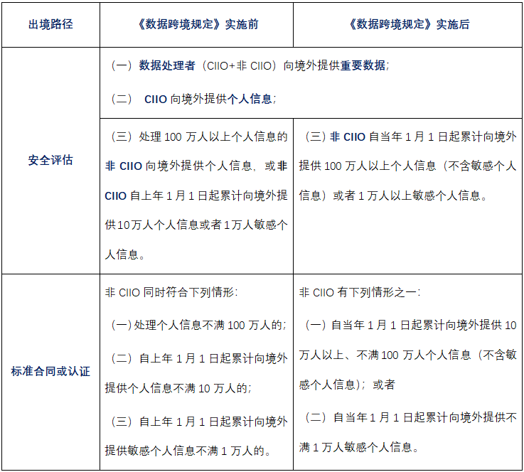 简而言之,《数据跨境规定》第七条和第八条带来的变化是,针对非CIIO向境外提供个人信息,部分出境情形从之前的安全评估变为可以选择标准合同或认证。然而,《数据跨境规定》对重要数据出境和CIIO的数据出境活动的监管并未改变和放宽,数据出境涉及境内重要数据时,无论数据处理者是否为CIIO,仍应通过安全评估;CIIO向境外提供个人信息,除了有限的例外情形外,其他情况下仍然应通过安全评估,例外情形包括(1)自贸区内的数据处理者,应遵循自贸区发布的负面清单履行相应的数据出境路径;(2)在“个人跨境业务”“跨境人力资源管理”“紧急情况”任一情形下,免予履行数据出境路径。