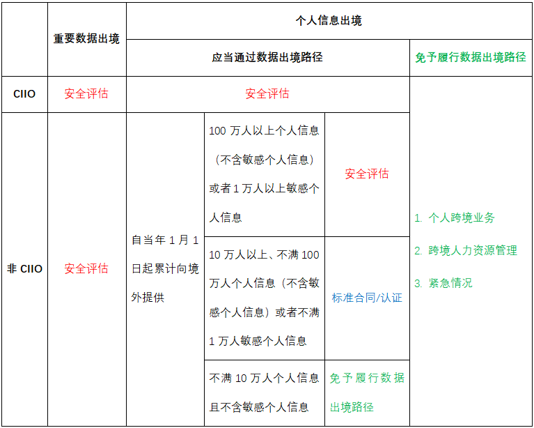 首先,判断是否存在3种免予履行数据出境路径的情形:任何数据处理者,无论是否为CIIO,在“个人跨境业务”“跨境人力资源管理”“紧急情况”任一情形下,免予履行数据出境路径;